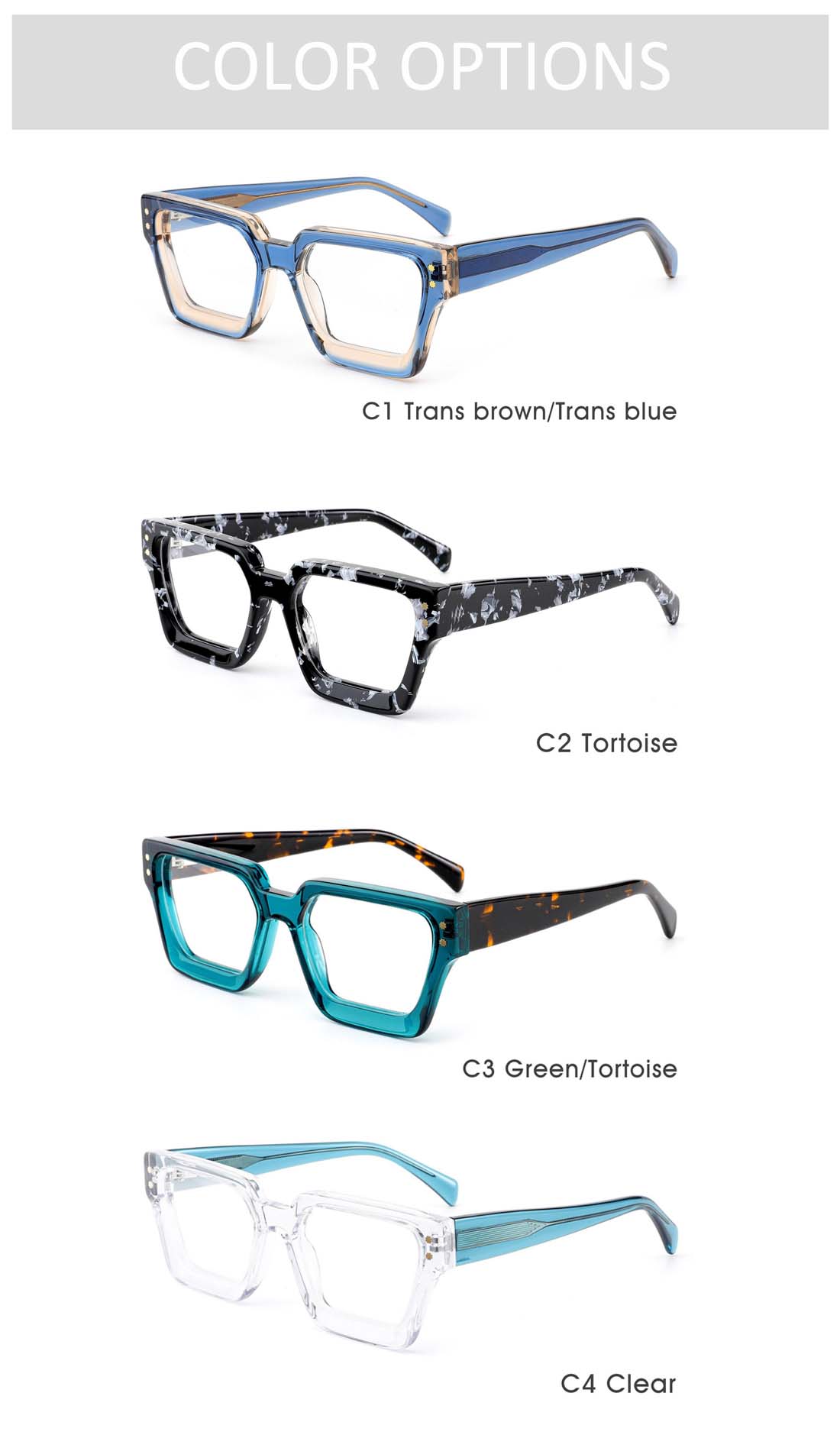 It has optical,strong,durable frame and clear acrylic non-prescription,non-polarized,no anti-blue light function,rectangle lenses.