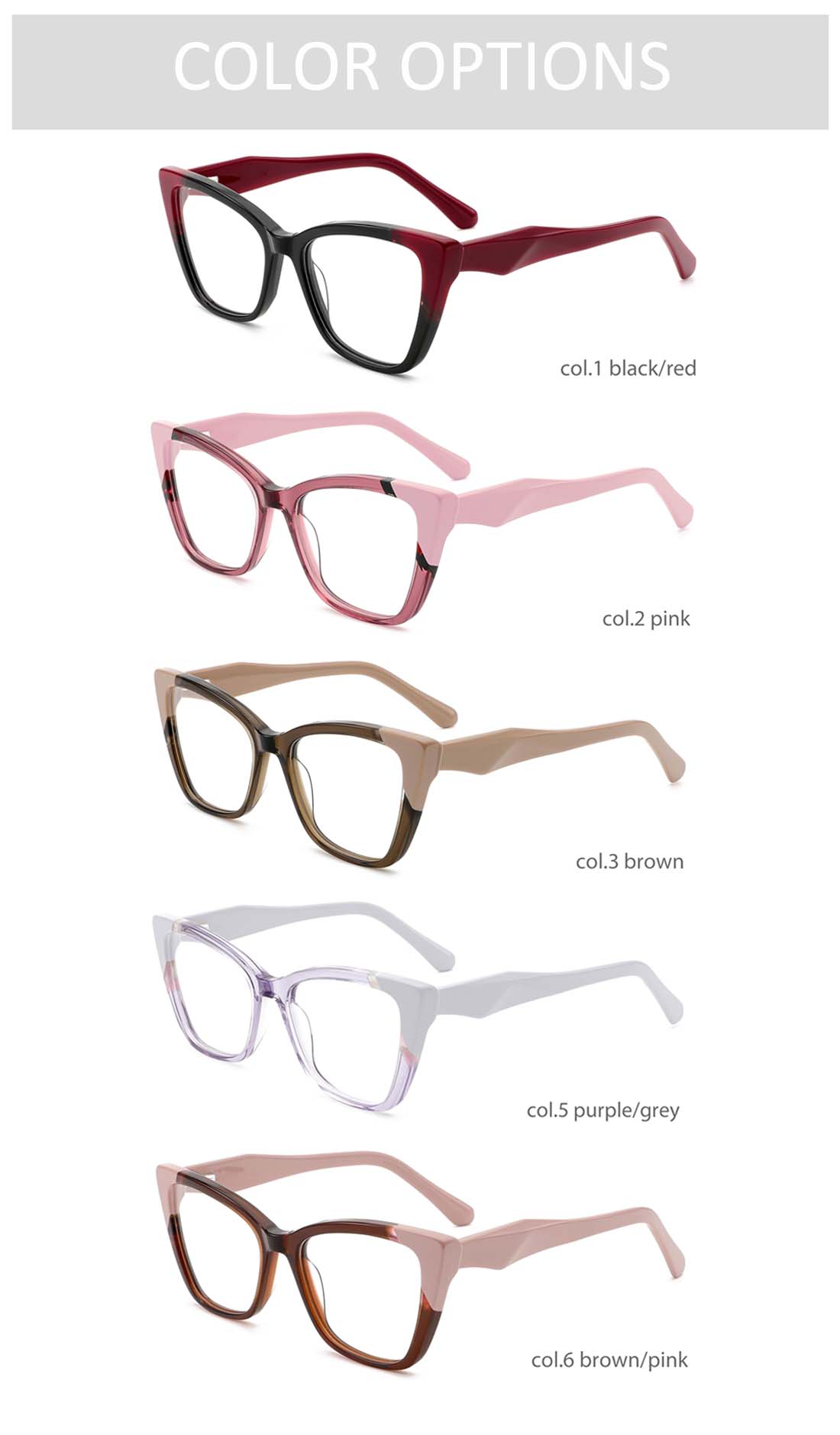 Fashion is all about individuality, and our mixed-material acetate frames embrace this wholeheartedly. The collection spans from retro-inspired cat-eye shapes (like the standout style here, perfect for customers craving vintage glamour with a modern twist) to sleek, minimalist silhouettes and bold, geometric designs.