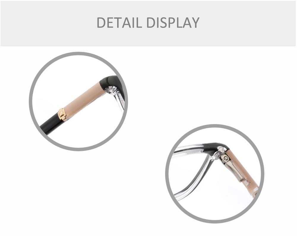 The product using life is more than 3 years after 42356 times of elastic spring leg testing. Durable flexible spring hinges perfectly fit different face size.And the high elastic spring leg can prevent it clip your face.The nose pads of the glasses fit the bridge of the nose, effectively preventing the glasses from slipping and imprinting the skin.The nose pads and hinges are designed to make the glasses less likely to fall off when you are looking down or exercising.