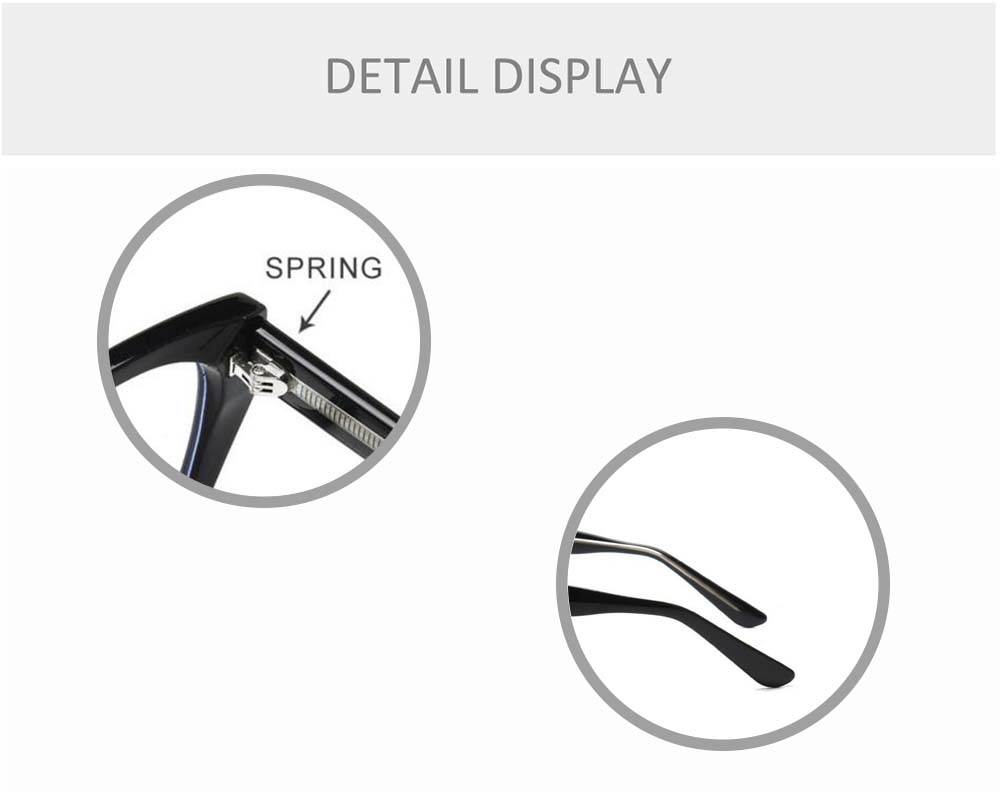 The product using life is more than 3 years after 42356 times of elastic spring leg testing. Durable flexible spring hinges perfectly fit different face size.And the high elastic spring leg can prevent it clip your face.The nose pads of the glasses fit the bridge of the nose, effectively preventing the glasses from slipping and imprinting the skin.The nose pads and hinges are designed to make the glasses less likely to fall off when you are looking down or exercising.